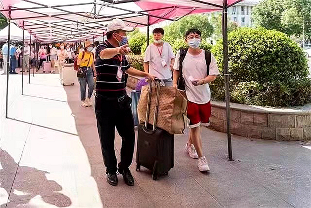 2021年迎新季,张余洋带着工作证帮助新生搬行李、作引导、话家常(受访者 供图)