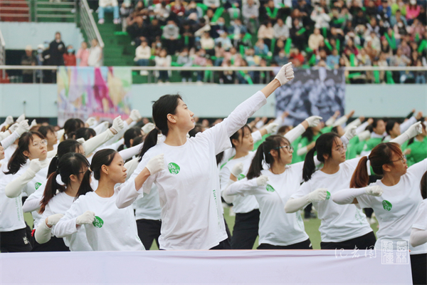 作为我校三大特色之一的广播体操表演与弹力绳表演随即而至,十四个院系,十四种色彩,他们成了红道绿场上一道靓丽的风景线。抬手,踢腿,他们的动作干脆利落;旋转,跳跃,他们的队形整齐划一。近乎极致完美的动作引得观众不断啧啧称赞,他们动作所展现的青春朝气,彰显了我校学子的精神风貌。