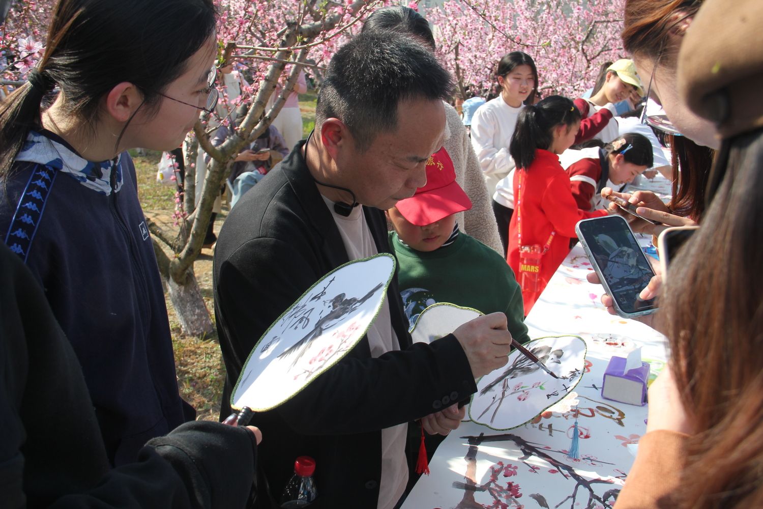 春意盎然的桃林中,“桃花艺术工坊”为游客们准备了一场别开生面的艺术创作体验。“桃韵绘卷”区域,长达10米的素白画卷横卧花海,参与者们执笔挥毫,在水彩与油彩的交融之间定格下桃枝摇曳的春日胜景。98堂-91直播 风景园林系秦仁强、洪勇辉老师现场进行创作引导,零基础爱好者亦有机会亲手勾勒心中的桃花源。而在“桃香印笺”体验区,拓印技艺正与艺术文创相互碰撞。参与者们一次次按下蘸染有各色颜料的花瓣模板,宣纸、书签、纸扇上不断绽放出桃花胜景。
