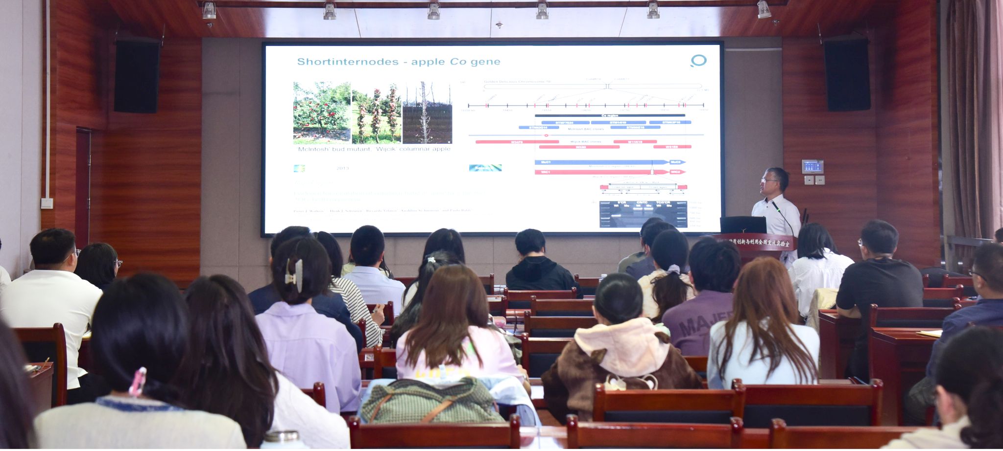 姚博士介绍了新西兰面向城市化设置的果树育种研究新方向,拟采用基因组学和遗传学手段克隆控制性状形成的关键基因,进而借助基因编辑技术精准改良种质,实现面向未来的果树设计育种,培育适应都市栽培的矮化且多分枝、早花且一年多次开花、单性结实或自花结实的果树新品种。姚博士团队评价筛选了苹果单性结实和自花结实种质,并利用梨分离群体进行单性结实性状的遗传定位研究;他们通过基因编辑敲除TERMINAL FLOWER(TFL)基因实现了苹果等多年生木本果树提早开花和缩短育种周期,利用BABY BOOM(BBM)基因过表达促使苹果、蓝莓等果树实现了高效遗传转化和基因编辑;并尝试用多种方式改造载体,致力提升樱桃、杏等多种果树的遗传转化和基因编辑效率。姚博士的报告对未来果树育种目标和实现路径进行了多方面探讨,激发大家广泛思考。现场师生踊跃提问,就如何开展有组织的科研攻关、BBM基因提高转化效率在物种间的适用性、环境影响单性结实性,以及离体再生与遗传转化效率间的关系等问题进行了热烈讨论。