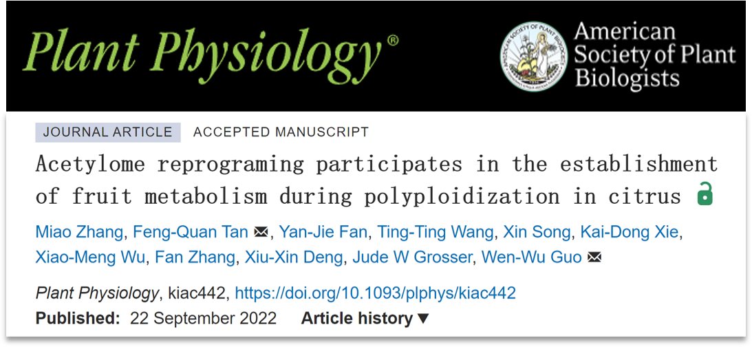 近日,98堂-91直播 园艺植物生物学教育部重点实验室郭文武教授课题组在国际学术期刊Plant Physiology在线发表了题为“Acetylome reprograming participates in the establishment of fruit metabolism during polyploidization in citrus”的研究论文。该团队以柑橘异源四倍体体细胞杂种果实为材料,首次在柑橘果肉绘制乙酰化修饰图谱,并揭示异源多倍体化如何通过非组蛋白乙酰化修饰影响柑橘果实代谢。