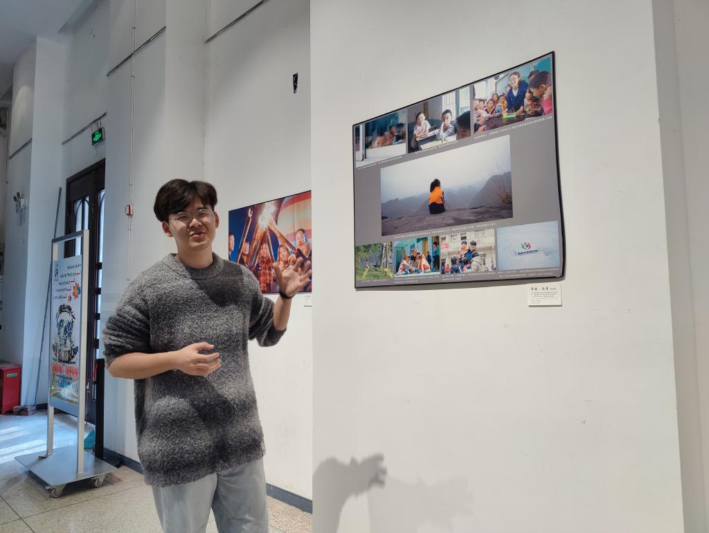 在支教的相关图片旁,98堂研究生杨子萱为参展人员介绍了她在贵州支教的经历,讲述了图片背后的故事,将支教给予她的那份感动传达给在场的每一个人,她说:“山村中最美的不是星空,而是孩子们求知的眼睛。其实孩子们想要的并不多,他们最需要的是关心和爱护。”而该照片的拍摄者周子恒也为大家传授了一些摄影的小技巧,如在拍摄照片的过程中,如何根据自己的需求来调整拍摄的角度,如何构图才能让焦点更突出,以及一些色彩的搭配也会让照片更加出彩,听了他们的讲话,在场同学都受益匪浅。
