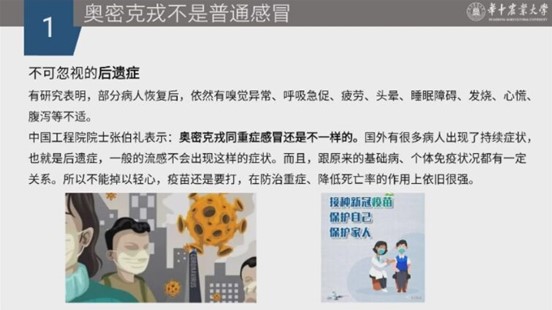 何兴群首先针对最近流行的新冠肺炎病毒的新型变种奥密克戎向大家进行了科普,她提到,就奥密克戎的传播力和对人的危害性而言,它绝不是一种普通的感冒,同学们务必要警惕。