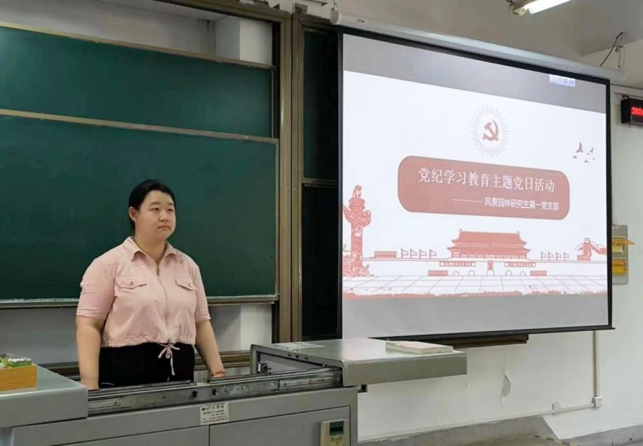 4月25日中午,风景园林研究生第一党支部在景园楼309开展“党纪学习教育”主题党日活动,会议由党支部副书记夏琳同志主持。