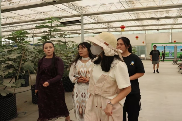 讲解员介绍道:“新疆盛世华强农业科技有限公司是新疆和田一家集设施果蔬的育苗、种植和销售,日光温室、拱棚和智能连栋温室的设计与建造、设施农业技术与设备研发推广为一体的综合农业现代公司。公司有超过1000个大棚,每个大棚都有单独职责,如果蔬生产、花卉培养、新品种开发、设施农业科研试验等。”