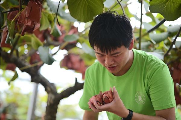 团队负责人园艺2202黄选旺看着手里的猕猴桃露出了笑容(通讯员 何伊博 摄)