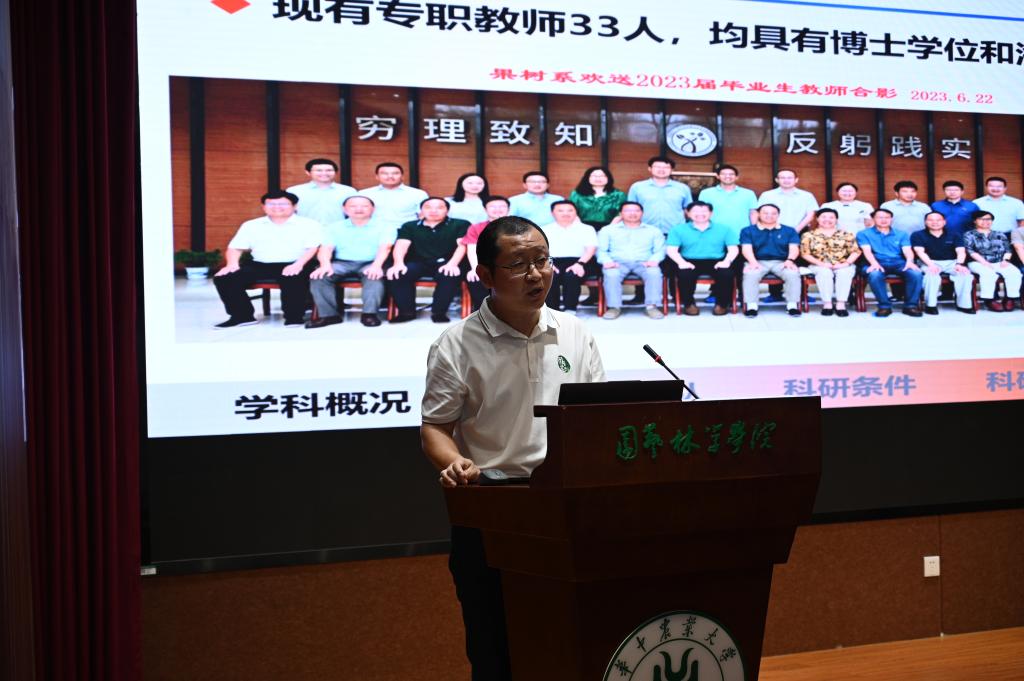 系主任刘军伟副教授从学科发展概况、现有研究条件、科研环境、人才培养计划和社会服务多个方面向各位新生介绍了果树学科的主要情况,为新生们描绘了一幅果树学领域的宏伟蓝图,鼓励新生们要珍惜在98堂 的学习机会,积极投身于果树学的研究与实践,为果树学的发展贡献自己的力量。