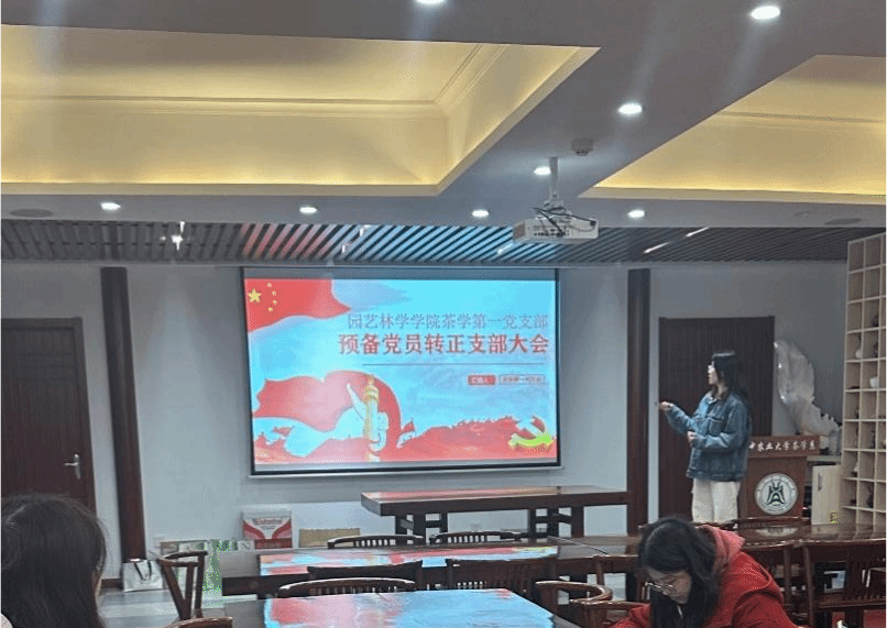 11月26日,茶学研究生第一党支部于园林北楼226室召开十一月份党日活动及预备党员转正大会。会议伊始,支书高天乐介绍了本次会议议程,并强调支委做好会议记录。