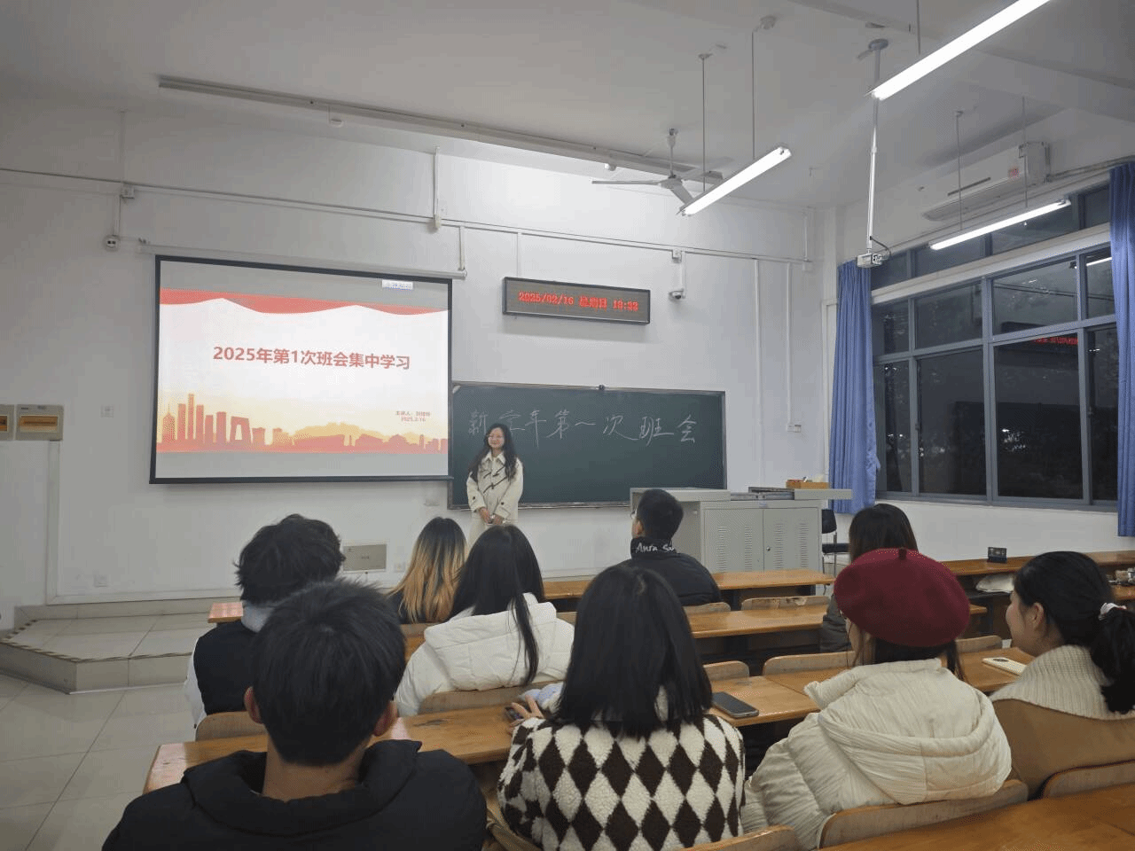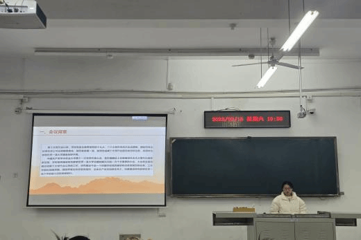 蔬菜专硕1班的班会由团支书昃雨娴主持。她带领同学们认真学习学校第十一次党代会报告,并号召同学们以实际行动践行党代会精神,共同营造安全、和谐、稳定的校园环境。