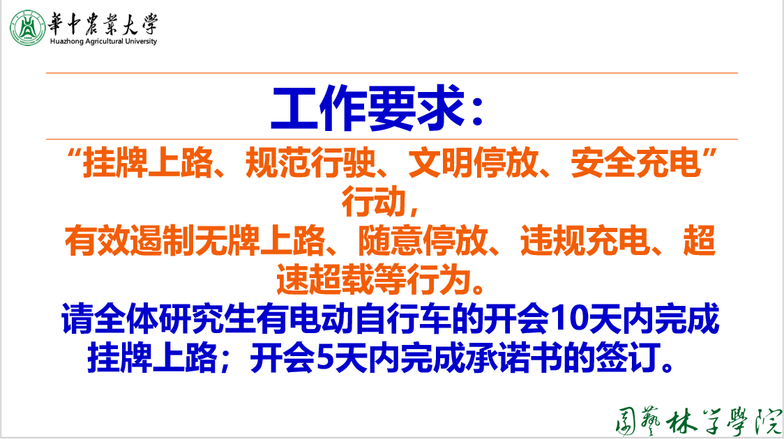 会议伊始,肖晗带领参会人员就“校园电动自行车专项治理行动”展开学习,学习内容包括武汉市公安局交通管理局“致广大师生的一封信”和98堂-91直播 “文明交通承诺书”、“电动自行车安全使用八不准”。会议强调,校内师生应安全乘驶,规范乘驶,不酒驾酒乘、不超速不并行、不占道不载人、不闯信号灯;应文明停车,规范停车,不占安全通道、不停线外区域;应安全用电,规范充电,不室内充电、不私接飞线。会议中肖晗建议大家,未上牌车辆尽量在10月15号之前上牌,10月20号后交警将在校内执法,违规者交警将会依法罚款或扣留车辆。同时,就室内充电问题肖晗也列举了室内充电瓶起火案例,他强调室内充电安全隐患巨大,不能冒险违规充电。学习结束后,肖晗对校内师生电动自行车使用提出要求并部署以下工作,首先要求电动自行车车要“挂牌上路、规范行驶、文明停放、安全充电”,其次要求全体研究生有电动自行车的会后10天内完成挂牌上路,会后5天内完成承诺书的签订。