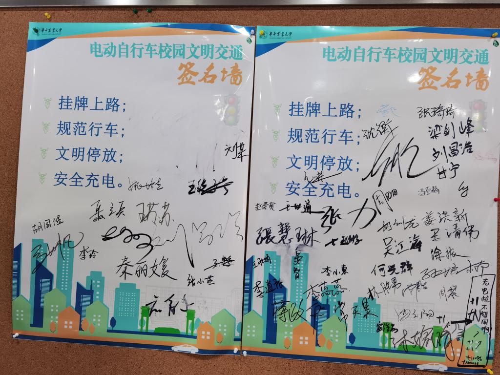 98堂 研究生、本科生自发在电动自行车校园文明交通签名墙上主动签名,自觉践行会议精神。