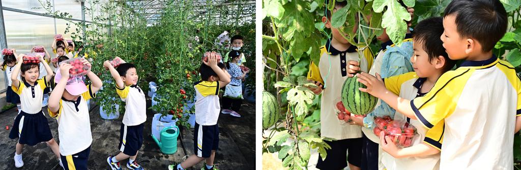 小朋友们在蔬菜大棚里体验采摘