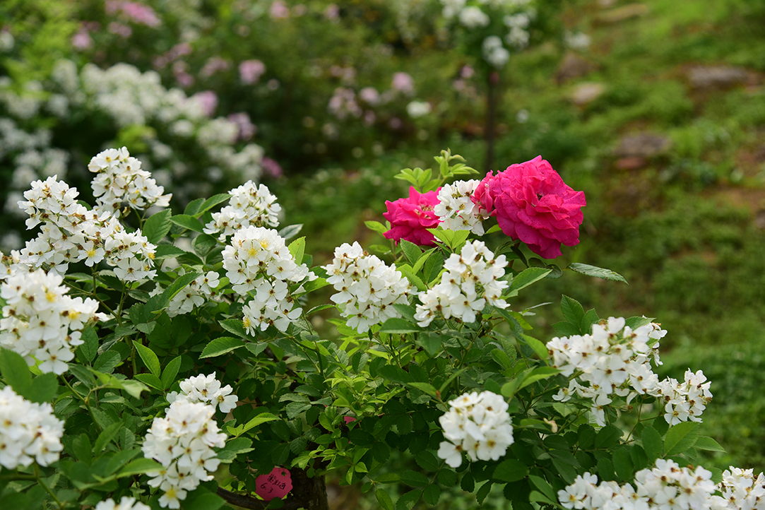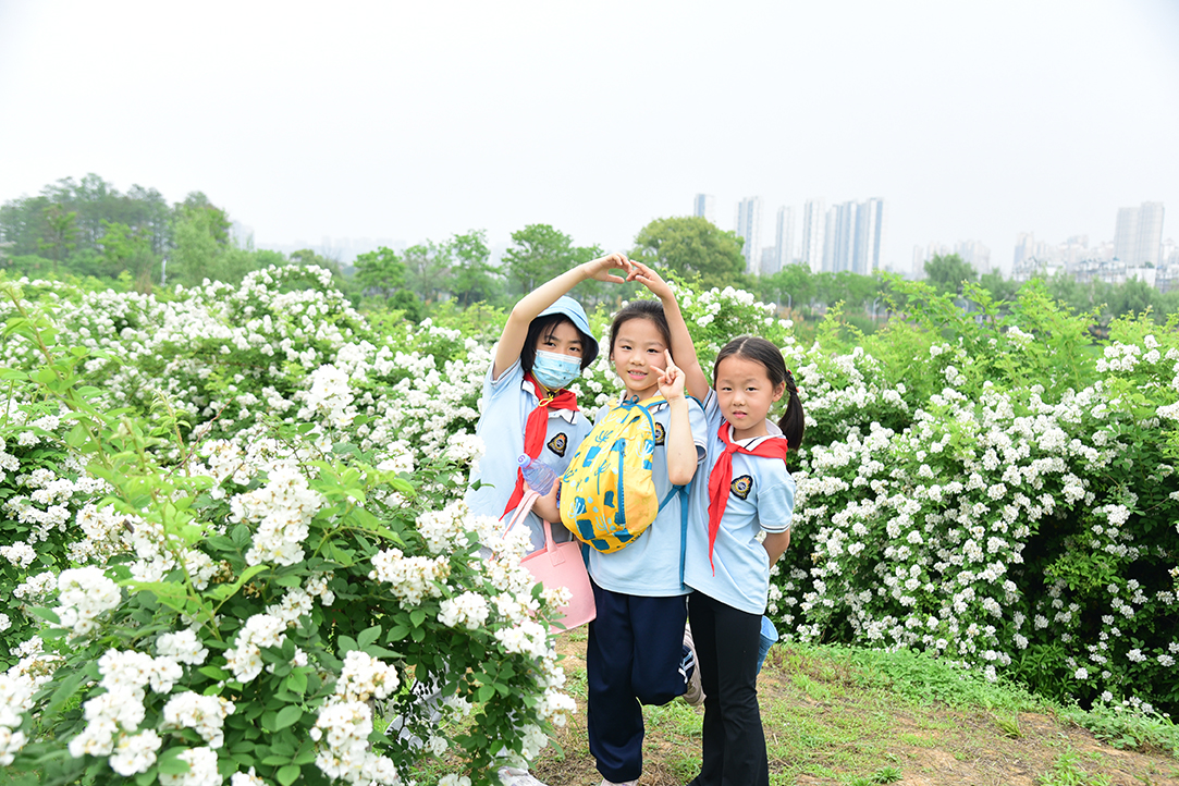当前正值盛花期。同学们在花圃里数数月季有多少种颜色,闻一闻各种月季花有什么香味,叶片、枝刺有哪些不一样的地方,跟随兴趣去提问和思考。走到一片野蔷薇前,盛放的白色小花层层叠叠宛若花海。仔细观察蔷薇花的花序,叶子的形状,托叶的裂纹……